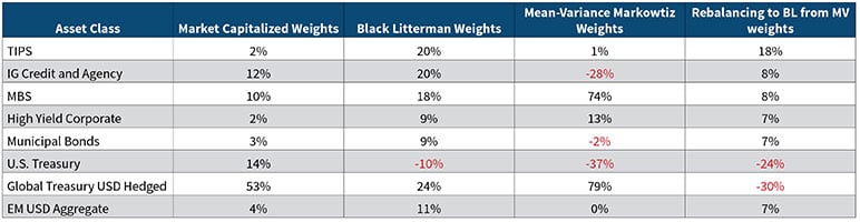 In the following hypothetical example of an insurance bond portfolio, although diversified across investment grade, high yield, emerging markets, TIPS, MBS, municipals and U.S. and global bonds, we have not used exposure to equities or commodities to hedge against inflation. This is because insurance companies, primarily life insurance, may be either reluctant to invest in them or may have rules barring investing in them. All bond prices, be it corporates or sovereign EM respond to changes in real and inflation rates and may have correlations that limit diversification. We think that the BL model overcomes this correlation problem otherwise seen in classical a MV optimized portfolio.