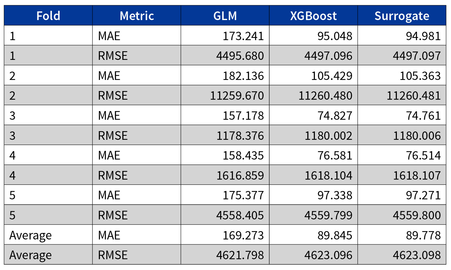 The two models produce similar RMSE, but XGBoost outperforms GLM on MAE. This suggests that XGBoost is better at predicting small errors. Given the focus of this article is to analyze the potential for surrogate models, we are comfortable with the model performance. However, it is important to note that XGBoost-based models generally can outperform GLMs. While that is not the case here, there are other articles that prove this and further the case for surrogates.[5]