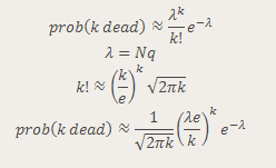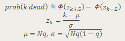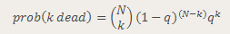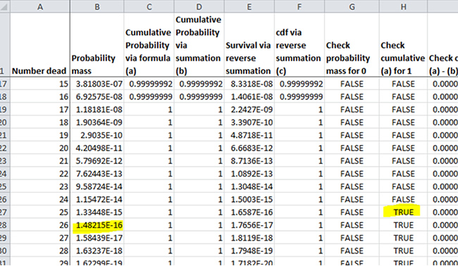 As we shall soon see, having that formula gives us the illusion that we have the “exact” answer. We actually have to calculate the elements within. If you try calculating the binomial coefficients up front, you will notice they get very large, just as those powers of q get very small. In a system using floating point arithmetic, as Excel does, we may run into trouble with either underflow or overflow. Obviously, I picked a situation that would create just such troubles, by picking a somewhat large number of people and a somewhat low probability of death.
