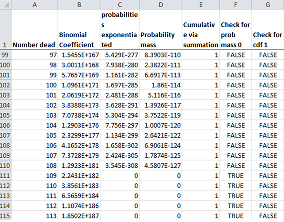 First, we see what is called underflow. In row 111, for 109 dead people, the term (1-q)(N-k) qk falls below the minimum magnitude expressible floating point number for Excel, and therefore is turned into zero ... without any warning.