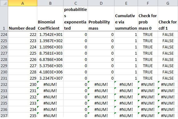 When one uses this approach, one gets a result that matches the BINOM.DIST result up to at least 14 decimal places. That's not fabulous, but what's nice is that one doesn't get underflow for the probability mass until 211 people dead, which is the same as BINOM.DIST. Unlike BINOM.DIST, the cdf never reaches one due to the loss of precision when adding small magnitude numbers to much larger ones. Another problem is that if you want to take this approach to calculate a single probability mass (say, 105 people dead), you have to calculate all prior probabilities.