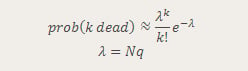 As we shall soon see, having that formula gives us the illusion that we have the “exact” answer. We actually have to calculate the elements within. If you try calculating the binomial coefficients up front, you will notice they get very large, just as those powers of q get very small. In a system using floating point arithmetic, as Excel does, we may run into trouble with either underflow or overflow. Obviously, I picked a situation that would create just such troubles, by picking a somewhat large number of people and a somewhat low probability of death.
