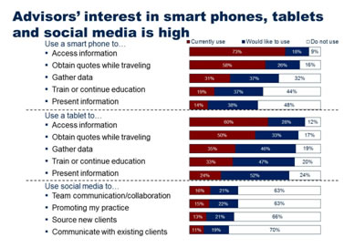 Today’s advisors recognize this need. Demands in the technology arena are more specialized; yesterday’s differentiators are today’s table stakes. To meet the needs of today’s clients, advisors are demanding more advanced technology for client acquisition and maintenance. Their interest in smart phones, tablets, and social media is high; a significant number would like to incorporate such technology to access information, obtain quotes, gather data, present information, and use for training/continuing education (Figure 2). Advisors also say they plan to increase use of social networking and video conferencing to contact their clients. In fact, our research shows that the number of advisors who expect to initiate daily or weekly contact with their clients via these methods is expected to rise significantly over the next three years.