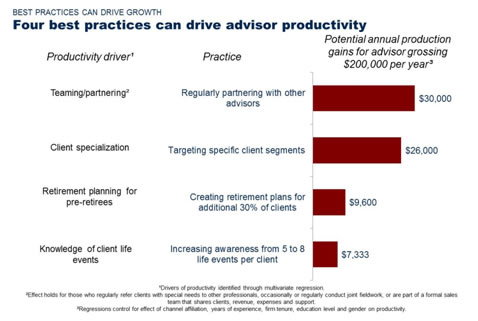 Our results also show that regularly partnering with other advisors can increase production 15 percent. The growth of team-based business models not only represents a change in philosophy, but also a change in culture that has implications for recruiting, talent management, client service, and practice support. The financial services industry to date has been built around a solo distribution model, where advisors build their own practice and their organization provides a compensation and support model that drives success.