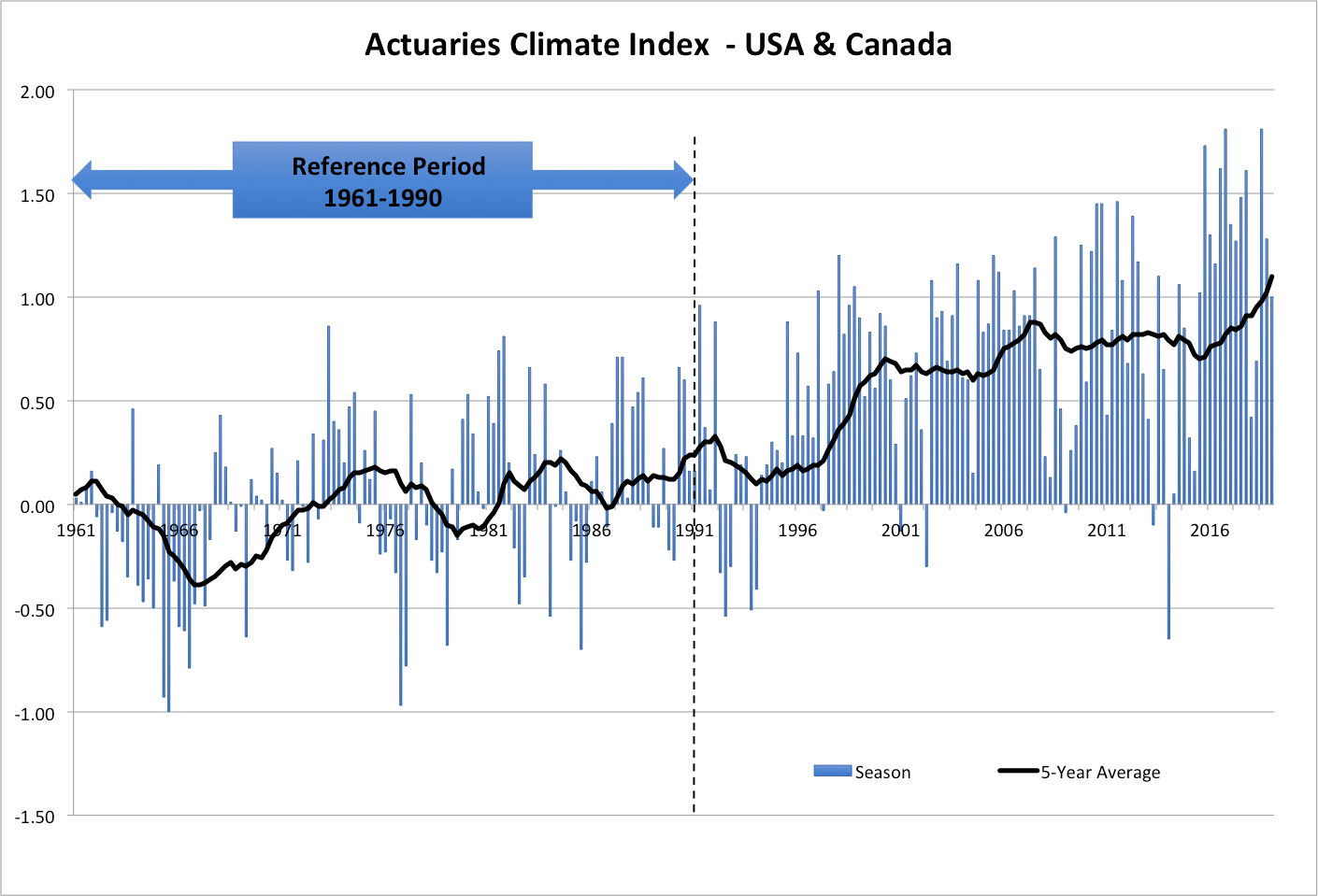Washington, D.C., Arlington, VA, Schaumburg, IL, and Ottawa, ON (August 29, 2019)—Organizations representing the actuarial professions in Canada and the United States have updated the Actuaries Climate Index (ACI) with data from the winter of 2018–19, with the 1.00 value for the season contributing to an upward trend in the average ACI value for winter.