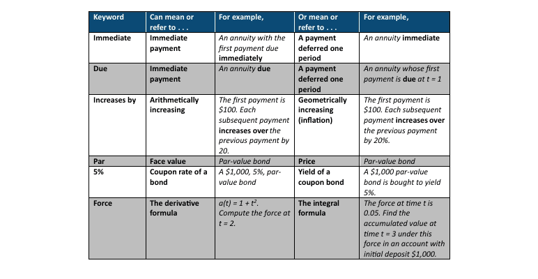 The approach suggested by this article to redeem the keyword strategy, making it useful and successful, is to teach that keywords may have multiple algebraic meanings. The student’s task when seeing a keyword is to recall its multiple meanings and decide which one is appropriate for the given problem. To illustrate this technique, Table 1 presents several keywords with multiple meanings from the Society of Actuaries (SOA) Financial Mathematics Exam (Exam FM) syllabus.[7] It is assumed that the reader is familiar with them.