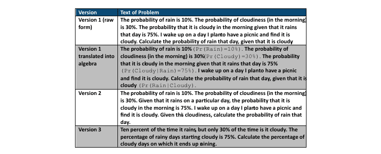 Table 2 presents three versions of the same problem.[9] Notice, that version 1 can be translated almost verbatim from English to algebra, as shown in the second row. For example, the English sentence “The probability that it is cloudy in the morning given that it rains that day is 75%” can be reformulated algebraically by translating the keyword given as a vertical bar (|) and the keyword is as an equal sign (=); these substitutions directly and immediately yield, Pr(Cloudy|Rain) = 75%. In contrast, versions 2 and 3 do not allow an immediate and direct translation using keywords. In other words, the keyword technique only works nicely for version 1.