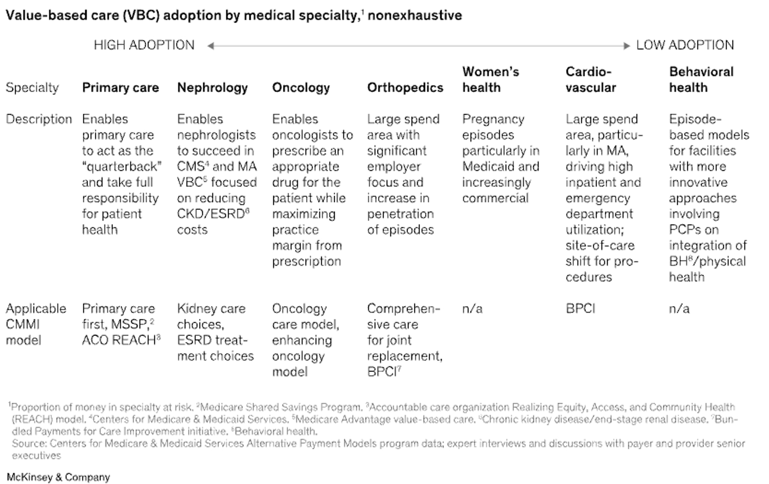 The continued momentum toward value-based care (VBC), including specialty-based value-based care (as opposed to primary-care based) in the U.S. has consistently been a top-of-mind topic for all health care stakeholders, including payers, providers, regulatory bodies, investors, and consumers. Broadly defined, VBC revolves around a shift away from payment to providers for volume (i.e., fee for service) to a broad range of different payment structures that reward the providers for meeting cost and/or quality-based benchmarks (e.g., bundled payments, shared savings with up or up/down-side risk, full capitation).