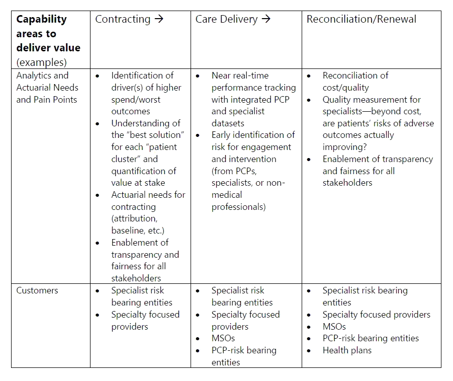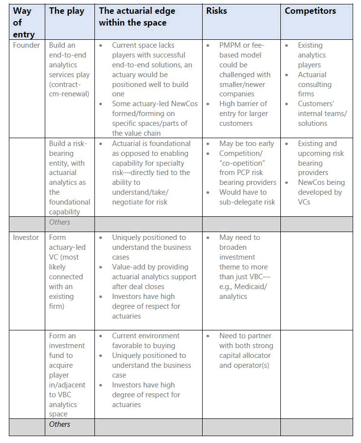 - Since the paths are not clear, there will likely be a variety of different plays, most of which will require actuarial analytics as a foundational capability. Examples of the variations within how players may choose to play within specialist VBC include: