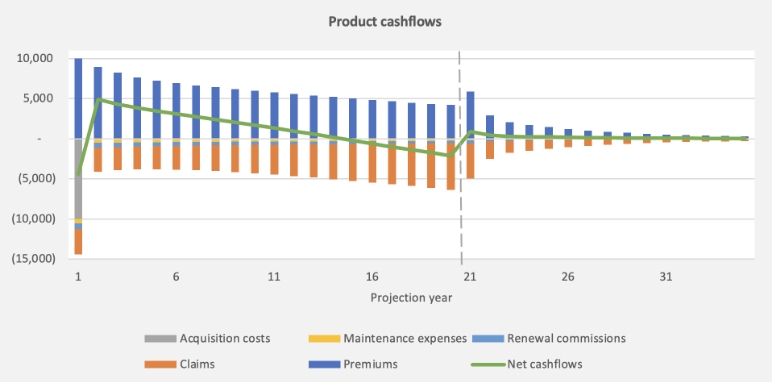The cashflow projection as of inception is illustrated in Figure 1 below, with the vertical dashed line indicating the split between the level term and PLT periods.