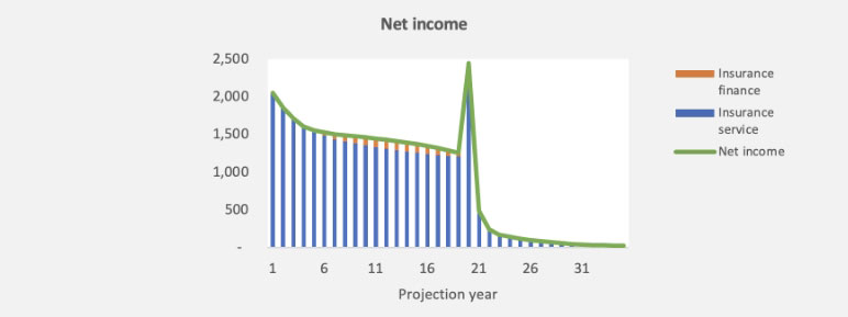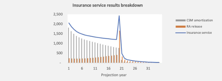 The projected net income is illustrated in Figure 2 below. As the graph shows, most of the net income is driven by insurance service results, which consist of CSM amortization and RA release. The component breakdown of the insurance service results is further illustrated in Figure 3 below.
