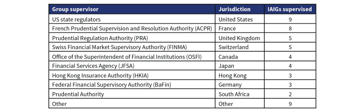 Group supervisors are generally the same regulatory bodies that oversee insurers on a local basis, for example, US state regulators, BaFin in Germany, the Office of the Superintendent of Financial Institutions (OSFI) in Canada, the Bermuda Monetary Authority (BMA), and the Hong Kong Insurance Authority (HKIA). The table below summarizes the number of internationally active insurance groups (IAIGs) supervised by each regulator (keeping in mind that group supervision is not only limited to IAIGs):