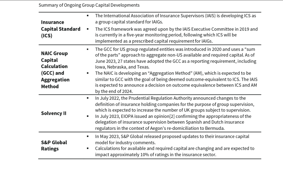 Global frameworks for group capital are still evolving. Additionally, non-regulatory bodies, such as rating agencies, also have a view of what constitutes an appropriate level of overall capital. Outlined below are some of the recent developments.