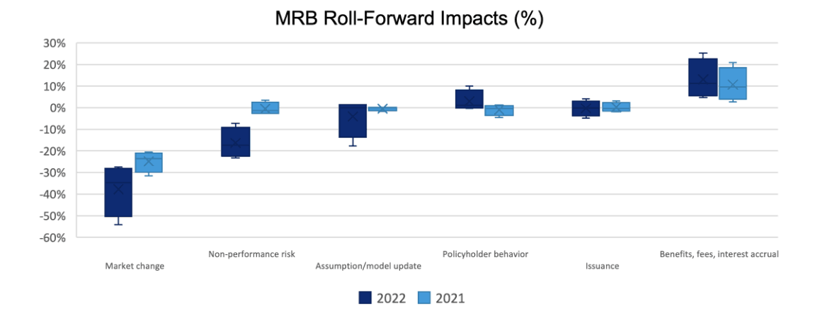 Over the two retrospective restatement years, 2021 and 2022, MRB volatility was caused by various factors. While financial markets produced the most significant reduction to MRB in both years, non-performance risk changed the most between the years, and assumption updates offset the impact of the variance between the expected and actual policyholder behavior.