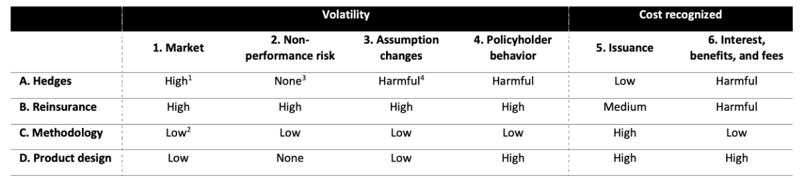 Forms of reinsurance that transfer market and behavior risks shine under most facets. However, the reinsurer introduces its risk and profit margin, increasing cost. Also, while reinsurance usually reduces non-performance risk volatility, reinsurance can also introduce some volatility because the direct policy MRB is based on the company’s credit rating and the non-performance risk flow through OCI. In contrast, the reinsurance offset is based on the reinsurer’s credit rating and the full impact flow through net income including non-performance risk.