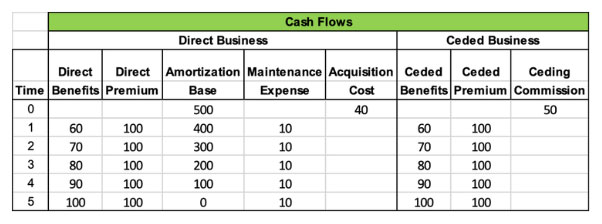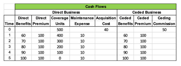Since the business is fully reinsured, premium and benefits are identical between direct and ceded.[3] The differences arise from the expenses including acquisition costs and maintenance expenses on the direct business and the ceding commission on the ceded business.