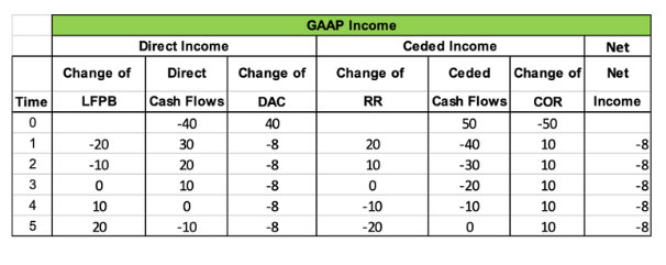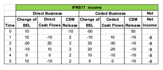 For the business scenario previously discussed for LDTI (with the same simplifications applying), as shown in Table 4, at the initial measurement, CSM differs between direct and ceded due to the differences between direct expenses and ceding commissions. At subsequent measurements, by assuming no actual-to-expected difference, change of BEL offsets with current period cash flow for both direct and ceded business. However, CSM is calculated by rolling forward from the previous period. Since the starting CSM balances for direct and ceded contracts are different by $40, the amortized amounts differ, resulting in an $8 loss in earnings in later periods, as shown in Tables 5 and 6.[5]