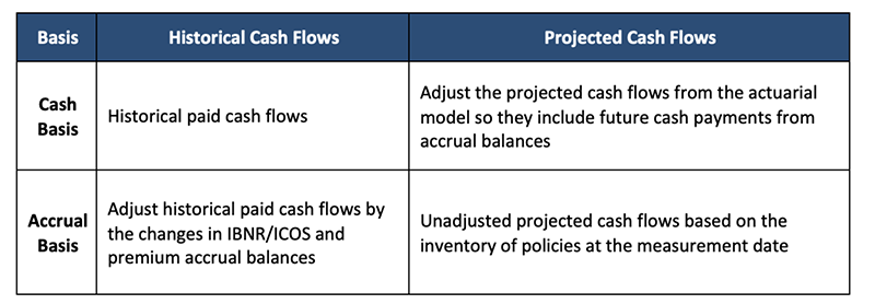 Under the cash basis approach, actual historical cash flows for the NPR calculation include only premiums received and benefits paid in cash. Projected cash flows for the LFPB and NPR calculation would similarly include cash items, such as future expected cash items from accrual balances. Under the accrual basis approach, actual historical premiums and benefits represent the earned premiums and the total benefits recognized in the income statement, whether or not such amounts were settled in cash. Table 1 summarizes how the historical and projected cash flows for LFPB and NPR would be impacted when using cash basis versus accrual basis to incorporate IBNR/ICOS and premium accruals.
