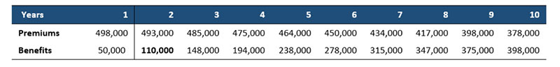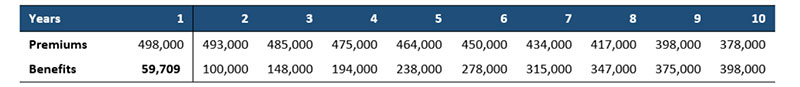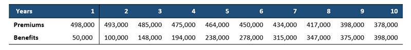 LFPB = Present value at the end of year 1 (PV1) of [projected benefits from years 2 to 10] – NPR * PV1 [projected premiums from years 2 to 10]