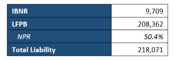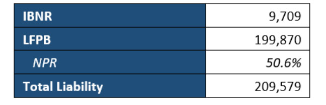 With the IBNR claim directly incorporated into the LFPB, a separate IBNR liability is no longer required, though it is often removed from the LFPB and reported separately on the balance sheet. The NPR is higher compared to Example 1 due to reflecting the IBNR claim in the projected cash flows for the LFPB calculation. The total liability the company holds in this example is $209,579, which is $8,492 lower than the total liability in Example 1.