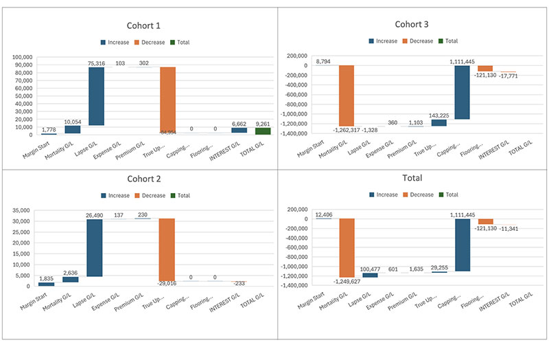 The SOE can also be presented as a waterfall chart. Note how the true-up of experience into the net premium ratio acts to depress gains on cohorts 1 and 2, and offsets losses in cohort 3. (See Figure 1)