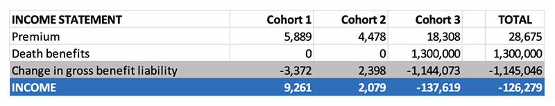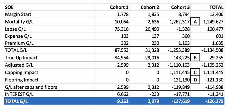 Table 1 below highlights that a loss in the current period is driven by mortality experience in Cohort 3 (A) partially offset by the true-up of the K-factor (B), and influences of floors (C) and caps (D). Cohorts 1 and 2 show gains from lapsation activities.