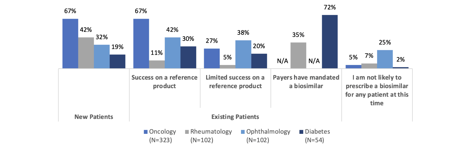 The familiarity with and willingness to prescribe biosimilars in rheumatology, ophthalmology and diabetes care seems to be lower. That said, 72 percent of prescribers are likely to prescribe a biosimilar to treat diabetes if it is mandated by the payer, which shows a possible path toward accelerating biosimilar uptake. Of course, payer mandates are not always viewed favorably by patients and prescribers and need to be considered thoroughly from the clinical and patient disruption perspectives before being applied.