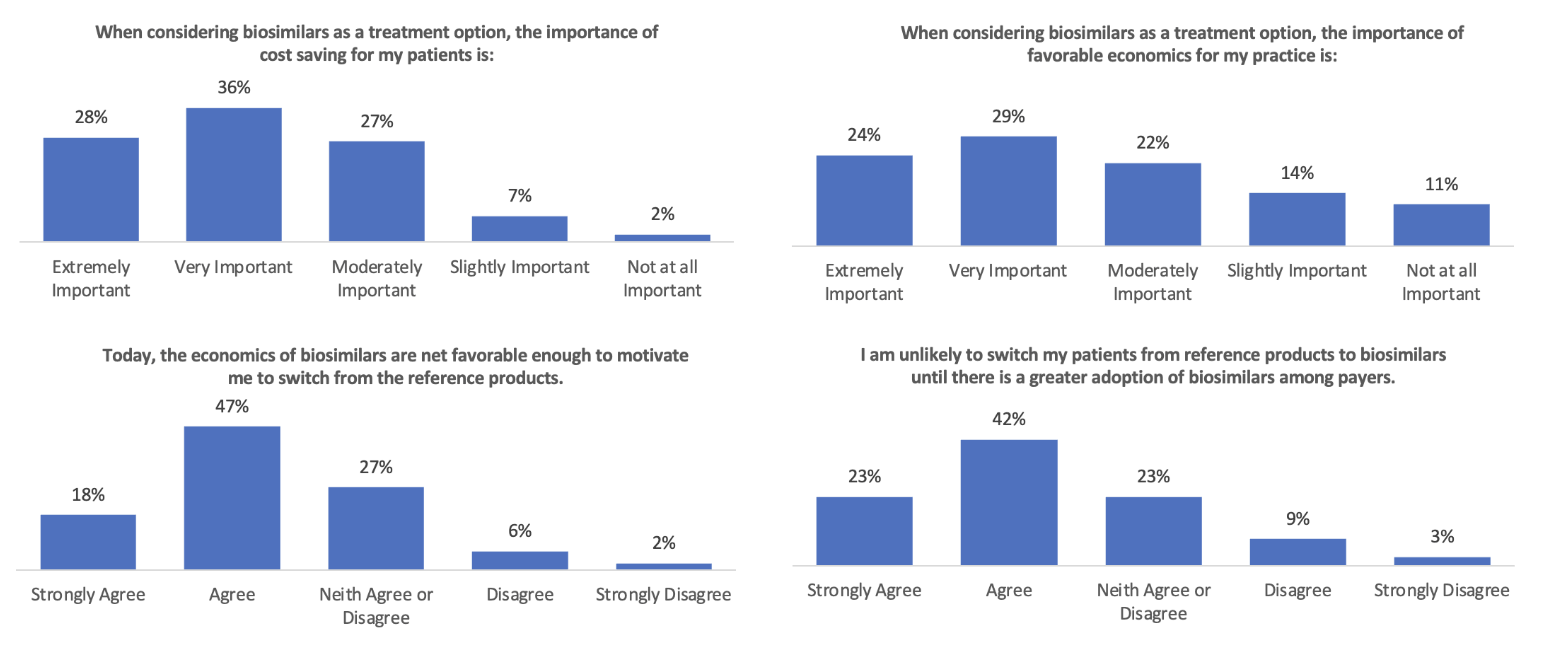 The survey results in Figure 3 show that while rheumatologists thought the economics of biosimilars were important, they did not think they were favorable enough (in 2022) to motivate them to “switch from the reference products.” It will be interesting to see if that changes in 2024 with many more Humira biosimilars available. That increase in competition will presumably drive net prices down.