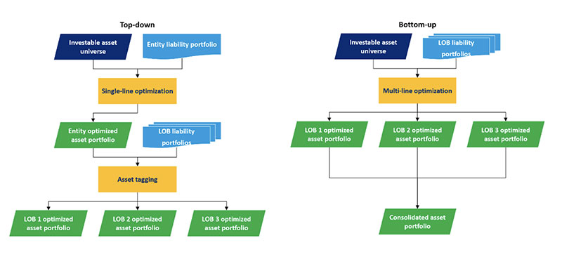 The bottom-up approach derives an optimized asset portfolio for each LOB by minimizing the sum of the LOB cashflow mismatch. These individual LOB portfolios are consolidated to derive the total company asset portfolio.