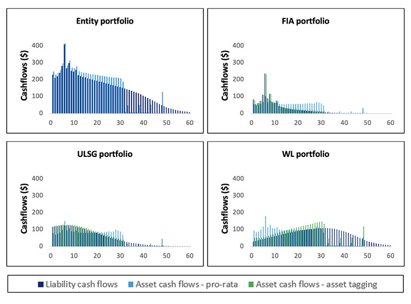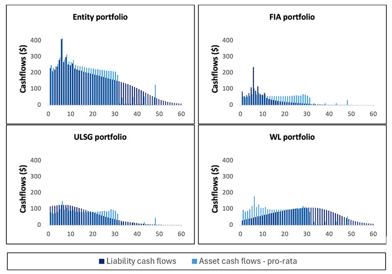 Figure 2 shows the graphs of projected asset and liability cashflows using the pro-rata asset allocation approach. For FIA, the pro-rata approach leads to a significant cashflow shortfall in year six and excess cashflows in years 11+. For ULSG, there are cashflow shortfalls in the first 20 years and in years 30+, and excess cashflows in years 21-30. For WL, there are excess cashflows in the first 20 years, and cashflow shortfalls in years 30+.