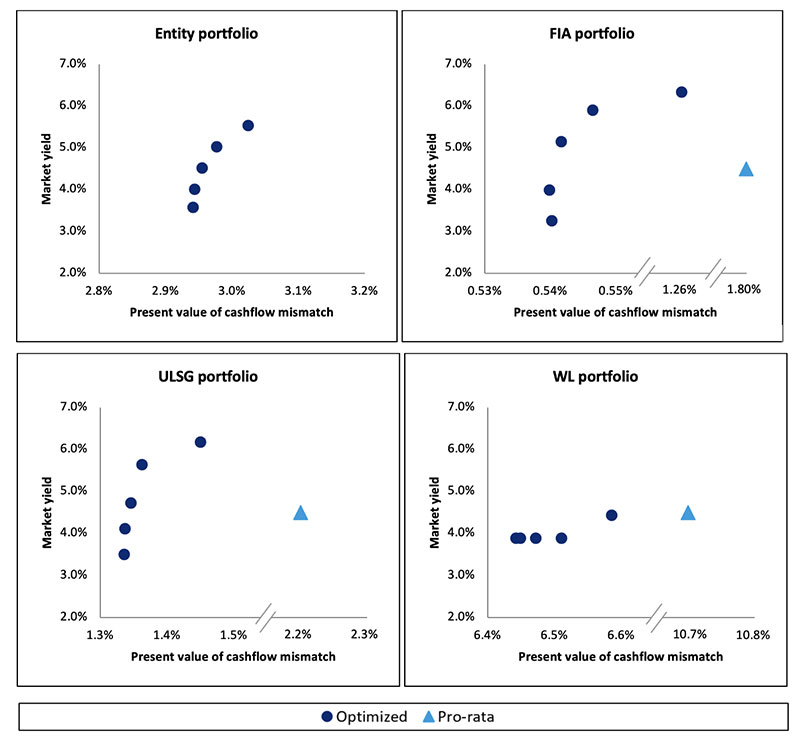 Figure 6 shows two bottom-up optimized portfolios on the efficient frontier with target yields of 5.0% and 5.5% compared to the current portfolio with a 4.5% yield allocated using top-down asset tagging. The bottom-up approach identifies opportunities to enhance yields and reduce economic reserves while still maintaining a similar level of cashflow match.