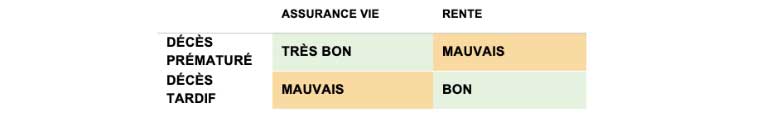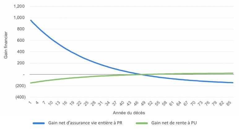 - Le produit de rente affiche une perte modeste en cas de décès prématuré et un gain modeste en cas de décès tardif.