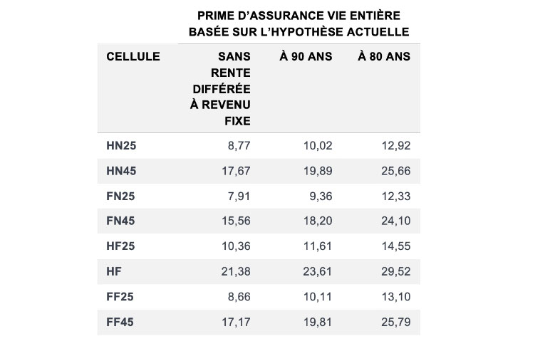 Le coût variera selon les particularités du contrat. Nous avons créé un modèle générique de rente différée à revenu fixe assorti d’un contrat d’assurance vie universelle simplifié basé sur l’hypothèse actuelle, d’après les hypothèses clés suivantes associées à la rente différée à revenu fixe :