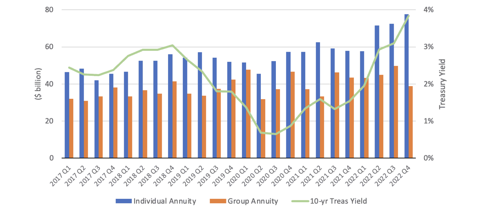 À l’exemple de la crise de liquidité des banques, s’il y avait des signes de rachats massifs pénalisant les assureurs, l’incertitude entourant la solvabilité des assureurs pourrait amener d’autres détenteurs à racheter leurs contrats, entraînant ainsi un cercle vicieux selon lequel les rachats additionnels dans chaque groupe successif de contrats exercent une pression supplémentaire à la baisse sur les niveaux de liquidité et de capital. Par conséquent, le risque d’une panique bancaire potentiellement accablante est le principal risque à gérer dans l’immédiat. Les ressources nécessaires pour accroître les liquidités et pour réduire les pressions sur le capital sont toutes deux limitées. Par contre, les nouvelles ventes réalisées très rapidement sur fond de hausse des taux d’intérêt ont elles aussi exercé des pressions sur le capital des assureurs, mais dans une autre direction. À l’échelle de l’industrie, les rentes fixes différées, les rentes indexées et les rentes immédiates ont connu des hausses des ventes respectivement de 113 %, 25 % et 37 % de 2021 à 2022 [ii]. Nombre d’assureurs ont déjà vu leur niveau de capital diminuer beaucoup plus rapidement que les années précédentes.