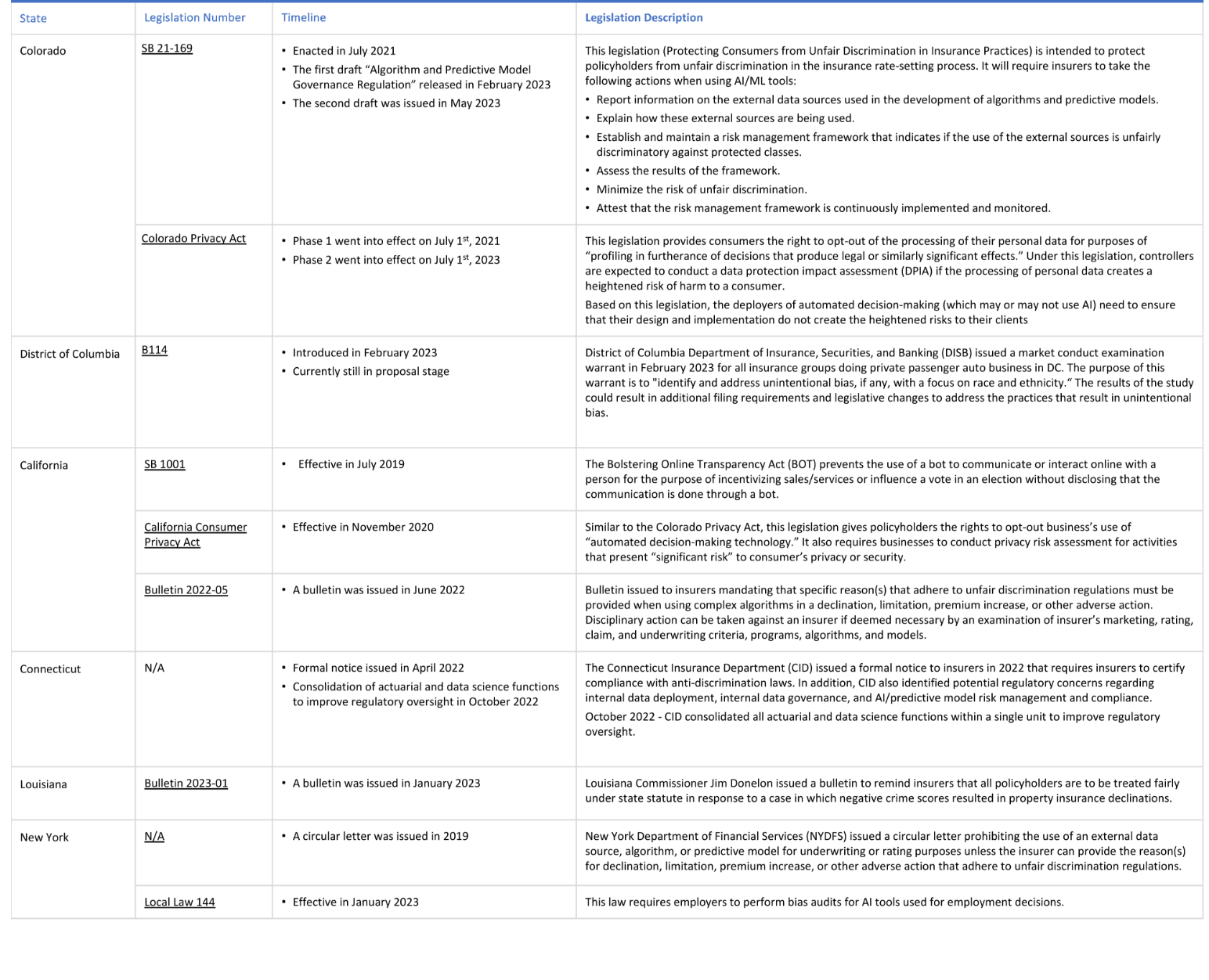 Table 1 illustrates the legislations that have been enacted or proposed in the six states that have been active in regulating the use of AI/ML models.