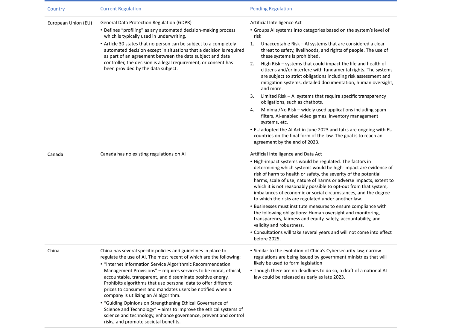 In addition to the United States, other countries have also taken steps to mitigate the potential risks associated with AI in insurance. Some countries are building upon existing regulations, while others are introducing new AI regulations. These countries include those in the European Union (EU), as well as Canada and China. Table 2 outlines the current and pending regulations in place for these countries.
