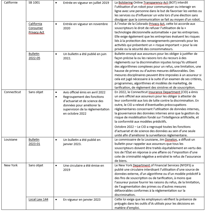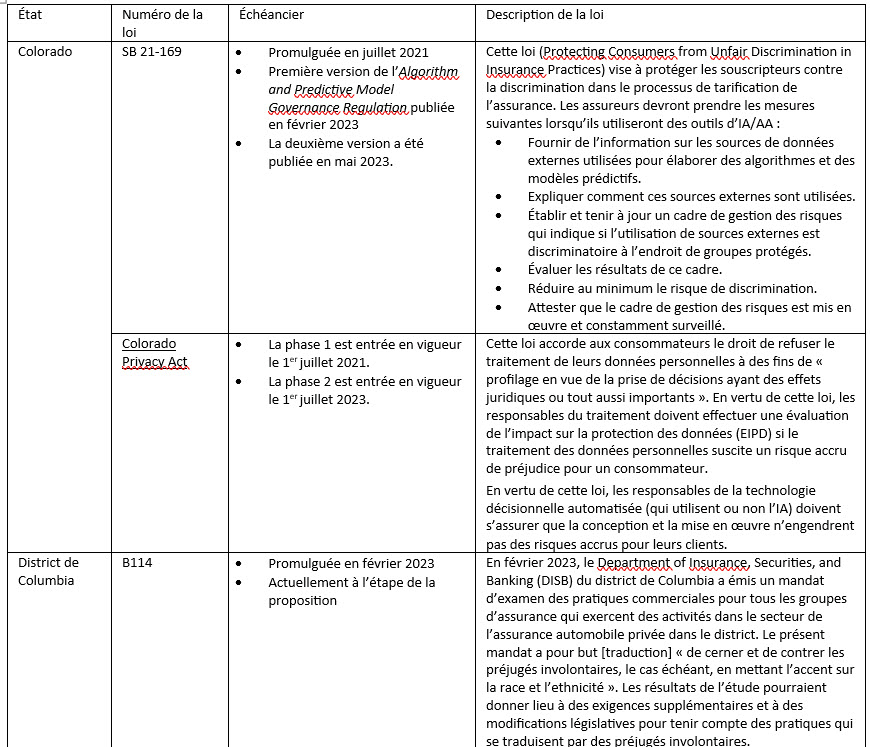 En juillet 2023, le H Committee de la NAIC a publié un exposé‑sondage sur un bulletin type de l’utilisation de l’IA par les assureurs. Cette ébauche décrit les attentes des organismes de réglementation des assurances en matière d’utilisation et de gouvernance de l’IA. Elle est fondée sur des principes et elle encourage les assureurs, sans les obliger, à élaborer et à mettre en œuvre un programme écrit d’utilisation de l’IA, de modèles prédictifs et d’algorithmes, pour s’assurer que leur utilisation ne contrevient pas aux normes légales existantes, comme les lois sur les pratiques commerciales déloyales ou d’autres normes légales applicables. Elle ne crée pas de nouveaux règlements.