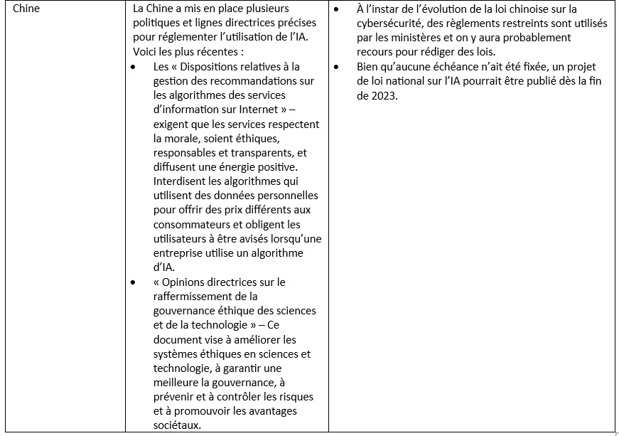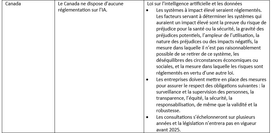Outre les États-Unis, d’autres pays ont également pris des mesures pour atténuer les risques éventuels associés à l’IA dans le secteur des assurances. Certains pays s’appuient sur la réglementation existante, tandis que d’autres adoptent de nouveaux règlements sur l’IA. Ces pays comprennent ceux de l’Union européenne (UE), de même que le Canada et la Chine. Le tableau ci‑dessous décrit les règlements actuels et à venir dans ces pays.