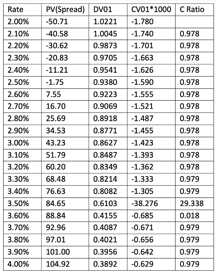 This will result in an approximated value at 3.5% of 84.59 (= 43.23 + 0.8627 * 50 – 0.001423 / 2 * 502) to which we need to add 12.16 (= 0.4155 * 30 – 0.000685 / 2 * 302) for the extra 30 bps from 3.5% to 3.8% using DV01 and CV01 at 3.6% to get to the total of 96.74. The dollar error becomes -0.27 (= 96.74 – 97.01) and the percentage error becomes -0.3% (= -0.27 / 97.1), obviously a tremendous improvement to the blind approximation.