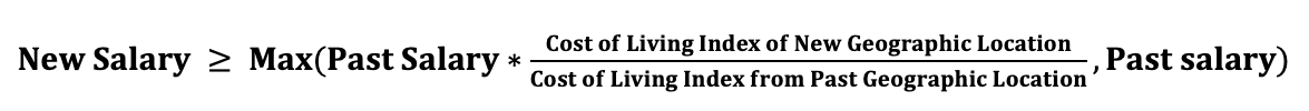 Companies can incentivize potential hires to move from their current company by giving them competitive salaries and benefits (e.g., health care, matching pension plan contributions). Salary per unit cost of living should be used as a metric when determining the compensation package of a potential hire. If relocation is required, the company can incentivize the move by offering a salary greater than the candidate’s current salary adjusted for the cost-of-living change. The following is a guide for how the salary of a new hire can be calculated: