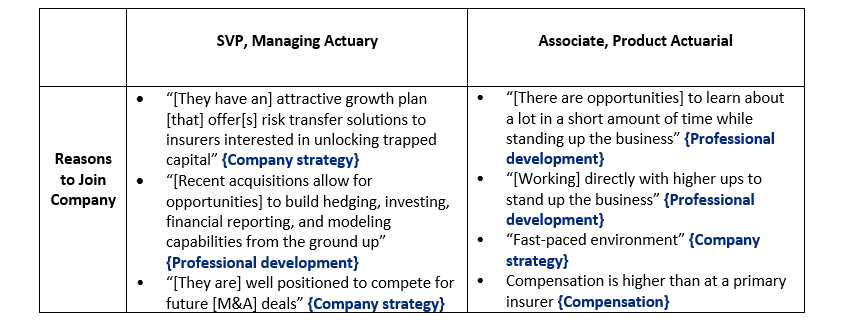 We looked at a company formed out of the divestiture of another insurer’s legacy business. The company grew rapidly from there through additional acquisitions, which required them to hire and retain more actuaries to keep up with their growth. We interviewed two actuaries at different levels, seeking insights into why actuaries chose to join. Responses from two interviewees can be seen in Figure 2.