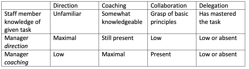 A beginning staff member typically lacks knowledge and therefore needs manager direction on how to do required tasks. As the employee gains knowledge and experience, the manager must both direct and coach them to maintain the improvement. As the staff member gains further experience, the manager-staff relationship becomes one of collaboration, where the manager no longer needs to direct but instead supports the staff member’s independent thinking. Finally, upon achieving mastery, the manager can delegate tasks to the staff member with little oversight.