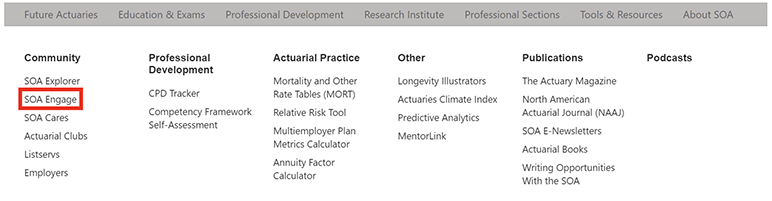 - Under “Tools and Resources,” select SOA Engage. Alternatively, you can directly access SOA Engage at https://engage.soa.org/.