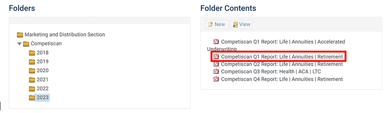- The Library contains historical Competiscan reports. You can access the reports for each calendar year by selecting the year, and then double clicking the quarterly report. Note that the name of each report indicates the topics it covers. For example, the 2023Q4 report includes Life, Annuities, and Accelerated Underwriting.
