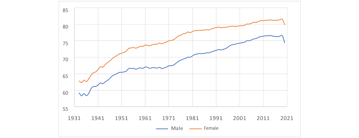 Figure 1 shows the U.S. life expectancy at birth by sex for the period 1933 to 2020, derived from the Human Mortality Database.[1]