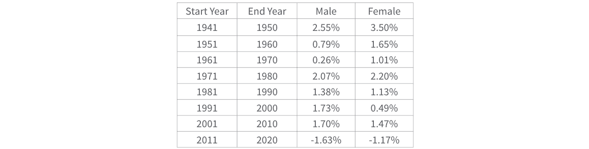 Figure 2 shows the average of these derived mortality improvement factors for 10-year periods beginning in 1940. Several observations jump out: