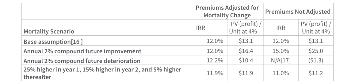 Note that the IRR is not always exactly 12% in the premium change scenario, as there are nonlinearities in the mortality sensitivity making it impossible to develop premium adjustment factors that are practically concise and exactly appropriate for all mortality scenarios. Also, our factors were chosen to maintain the IRR at the level anticipated at issue, but the resulting profit per unit remains modestly volatile. Other profit targets could be utilized instead. However, the results for the mortality-indexed product are much more stable than those of the level premium product, which can be very appealing from a risk management perspective.