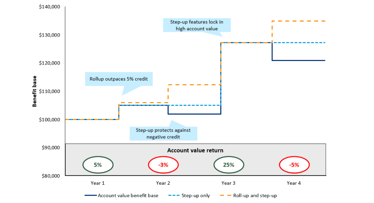 Figure 2 projects the benefit base for each design assuming a starting premium of $100,000. The roll-up is assumed to be 6% compound interest.