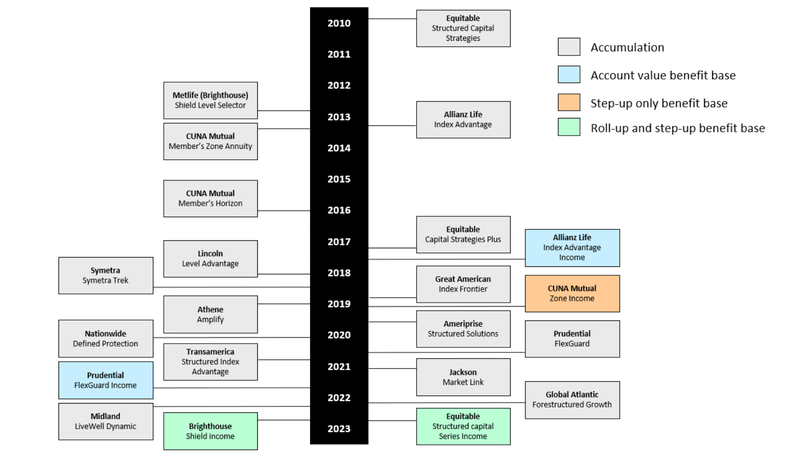 Given the growth in RILA sales, many carriers have entered the market. The first RILA GLWB was launched in 2018 by Allianz Life. CUNA Mutual, Prudential, Equitable, and Brighthouse have also launched RILA GLWBs. We expect additional carriers to follow suit to maintain their position in an increasingly competitive market.