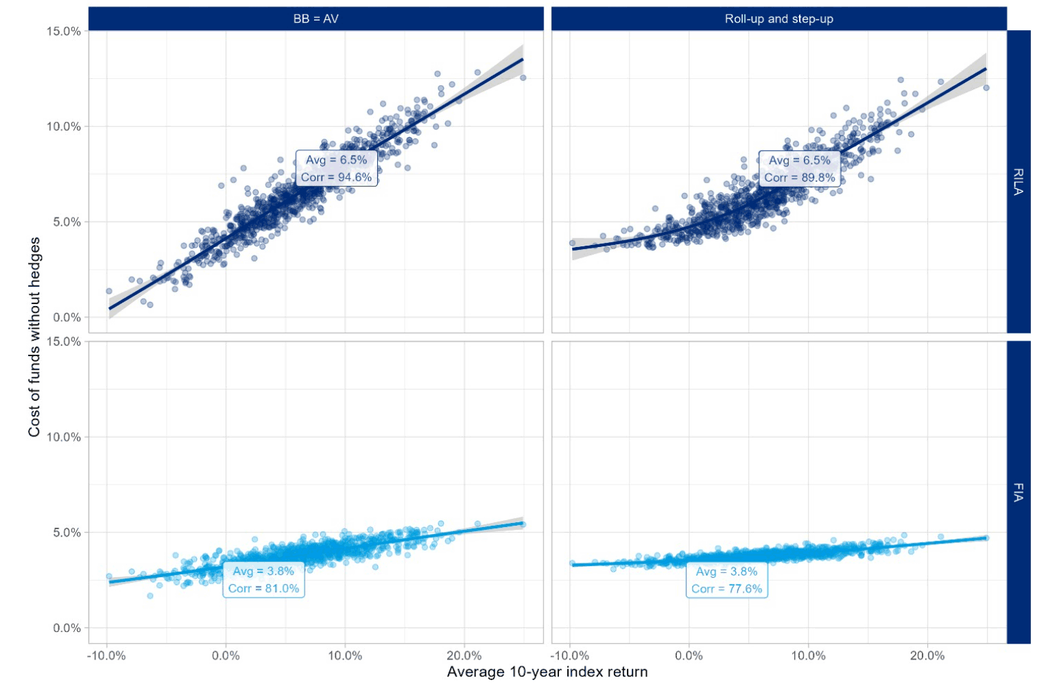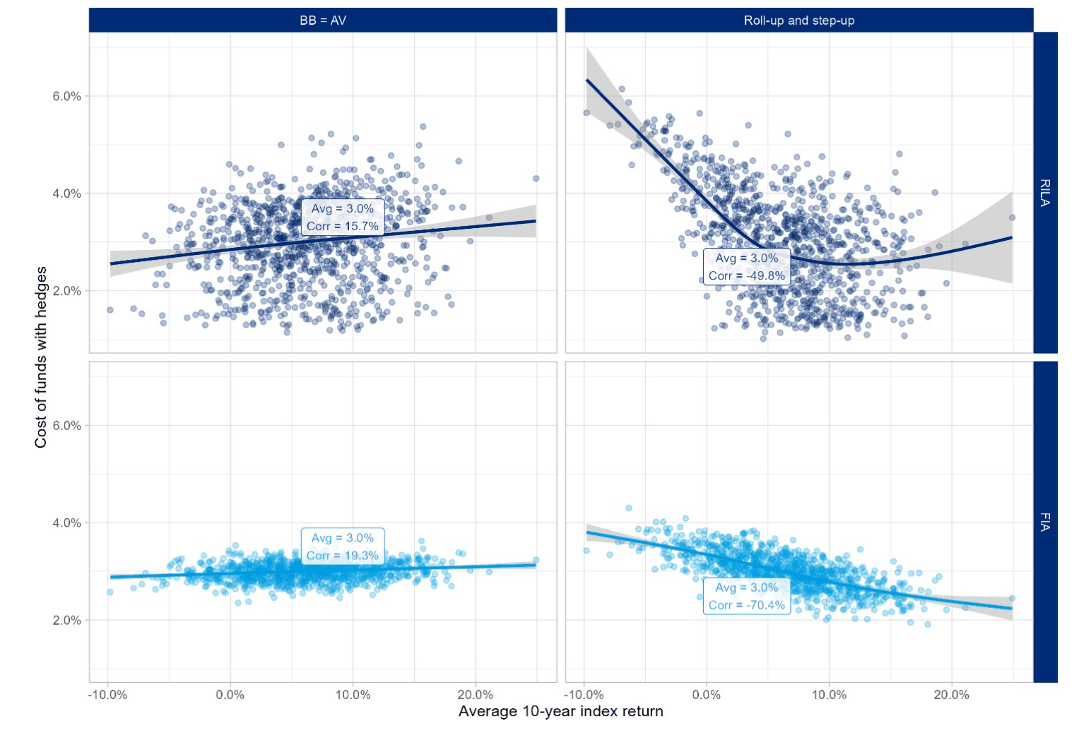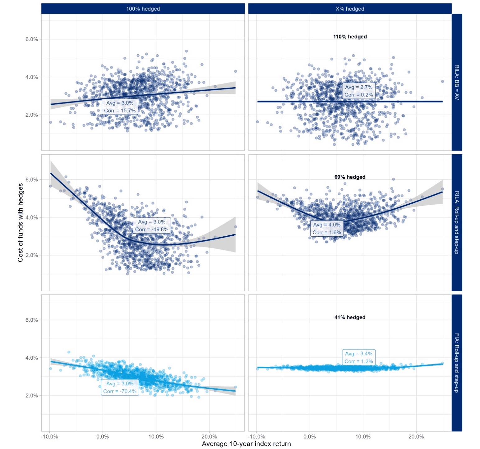 Figure 4 shows the relationship between average index performance in the first 10 years of the scenario set on the x-axis and the CoF for each design described above assuming no hedging on the y-axis.
